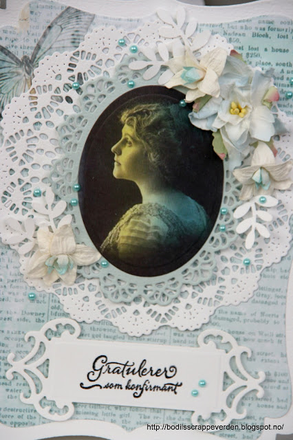 Jeg sliter fortsatt med kreativiteten for tiden, jeg vil så gjerne men for det liksom ikke til.  I det siste har det blitt mer shopping enn kortlaging, har kjøpt maange nye dies, som ligger uåpnet. I helgen fikk jeg endelig satt meg ned og laget kort, det ble faktisk 5 stk i alt, de fleste ble veldig enkle, som dette, men det er en begynnelse. På dette kortet har jeg brukt nye spellbindersdies og ny Martha Steward punch. motivet er et jeg hadde liggende, og mønsterpapir og tekst (rub ons) er fra melissa frances. Jeg håper jeg for testet ut resten av diesene også. :)